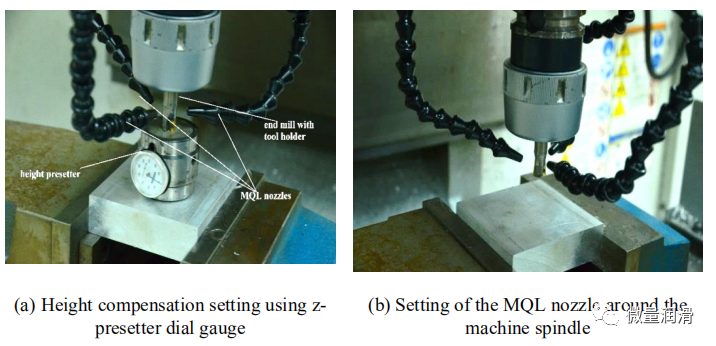 MQL通過系統傳送到切割區。霧系統由用于空氣和潤滑劑混合的同軸噴嘴組成,保持恒定的霧化速率;通過計量泵的自動循環連續外部潤滑,由空氣壓力和柔性噴嘴供電的可變速率脈沖發生器(4-200脈沖/分鐘),提供定位的靈活性。脈沖發生器產生計量泵的重復循環。采用1滴計輸出6噴嘴配置。系統設置6臺正排量油計量泵(0.2-1.00毫升/沖程),行程可調,輸出可調。采用空氣計量泵控制氣流進行霧化。MQL系統的不同組件如圖3所示。通過將行程長度設置為10來調整MQL流量,而根據逆時針旋轉來調整流量。