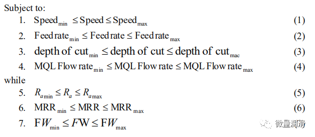 除了目標函數外,加工操作也是由約束有效地定義的。這些約束是由過程能力和產品需求定義的。工藝能力包括實際的機器條件,允許的切削主軸轉速,進給率,最大發熱量和最大機器功率,而產品要求包括產品表面光潔度要求和所需材料去除率。為了執行有效的優化,這些約束必須完全滿足。作為研究最優切削參數的解受一些邊界條件的約束。在所提出的情況下,邊界約束設置在實驗范圍內。