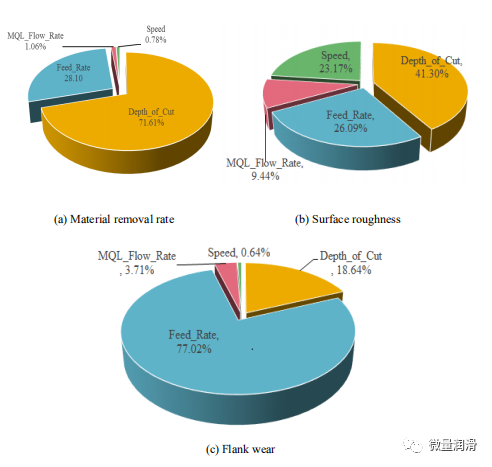 輸入參數的意義是根據高、低水平兩組實驗設計的平均值的差異來確定的。通過使用DOE確定參數效應大小來評估主要參數的相對重要性和排名及其與響應變量的相互作用,如圖4所示。總體餅圖和表(圖4表2)顯示了每個輸入變量相對于總體響應的貢獻。從表面粗糙度的學生圖可以看出,切割深度和工作臺進給率是最重要的因素,而對于材料去除率來說,最重要的因素是切割深度。在側翼磨損的情況下,進給率是最有效的參數。