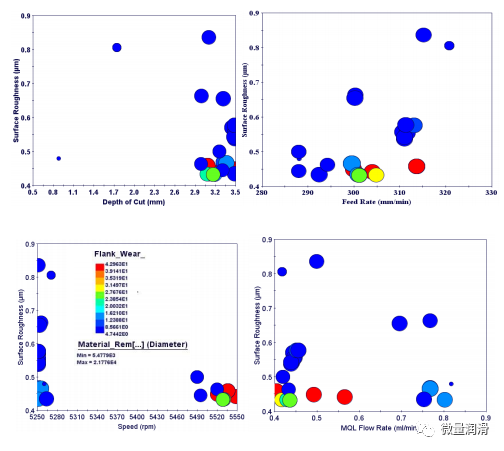多目標優化的結果是從總共2600個設計中得到的一組1896個可行設計,其中39個設計屬于帕累托前沿,即非支配帕累托最優解的集合。帕累托設計相對于輸入設計變量的分布用氣泡圖表示。在氣泡圖中,x軸表示設計變量,而在y軸上表示一個響應變量,即。在這種情況下,表面粗糙度被繪制,而氣泡直徑和氣泡顏色分別表示材料的去除率和側面磨損。圖5顯示了帕累托最優設計相對于輸入變量的分布。圖5(A)顯示了隨著切割深度的增加,帕累托設計的分布。大多數帕累托設計位于整個切割深度范圍內,最佳設計從0.5毫米到1.7毫米。對于進率,帕累托設計的分布(圖5(B)顯示,大多數設計是在280毫米/分鐘到300毫米/分鐘之間獲得的。一些表面粗糙度和側面磨損較低的設計也發現了較高的進給率。幾乎所有的帕累托設計都是以最小速度找到的,如圖5(C)所示)。最可行的帕累托設計是在0.77毫升/分鐘到0.80毫升/分鐘的MQL流量范圍內得到的,如圖5(D)所示)。為了在位于帕累托邊界的解決方案中選擇一個最優的折衷方案,采用多準則決策技術。根據響應變量之間的非偏好關系,所有的解都被分類為秩值。表3給出了初始解和最優解在自變量、目標參數和約束方面的比較。常規MQL中未涂覆碳化鎢插入件的表面粗糙度比初始最小值高25.7%,但表面粗糙度值仍低于最高值74.2%。側翼磨損的最小值增加了1.0%,而最大側翼磨損值則提高了58.4。材料去除率的最優值相對于最小測量值要高得多。