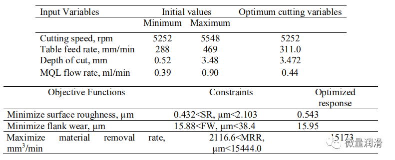在上述研究中,采用遺傳算法對具有最小潤滑量的數控銑削操作進行了多目標優化。刀具的表面粗糙度、材料去除率和側面磨損是有待優化的相互矛盾的響應。從可行的設計中,選擇帕累托設計進行進一步的研究。針對帕累托設計,提出了一種多準則決策算法。這些設計是根據它們的適合度來進行最優標準的排序的。給出了三個目標函數的等權重,得到了優化設計。在同等重量的情況下,得到的最佳設計是5252rpm的設計,進料速率為311mm/min,切割深度為3.47mm,MQL流量為0.44ml/min。表面粗糙度的最佳值為0.543µm;材料去除率為15173mm3/min,優化后的側翼磨損為15.95µm。由此獲得的一系列可行的實驗設計以及選定的優化設計可以作為定義域內制造實踐的未來基準。